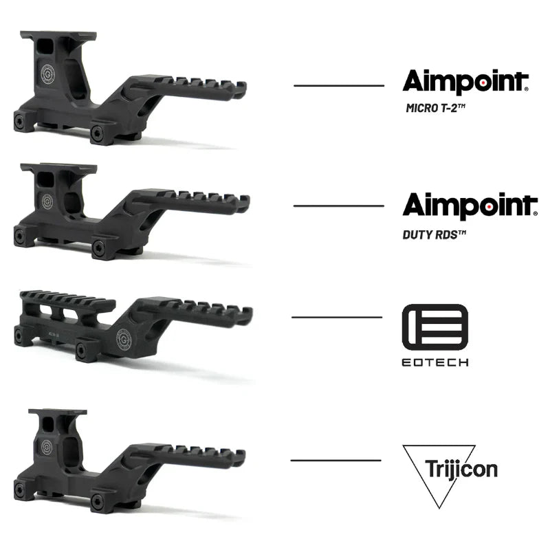 The unique and patented design offers an elevated MIL-STD-1913, or Picatinny platform for directly attaching accessories such as lights, optics, thermals, and aiming devices. It’s perfect for the super short PDW/SMG platforms where rail space is limited, but mounting a light and aiming device is still critical. The pass-through on the neck allows for cable management or iron sight passthrough on the AIMPOINT® and Trijicon® variants.